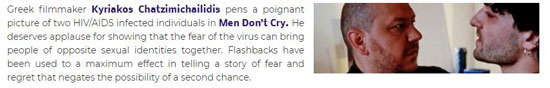 "Ο Έλληνας σκηνοθέτης Κυριάκος Χατζημιχαηλίδης γράφει μια συγκλονιστική εικόνα δύο ατόμων που έχουν προσβληθεί από τον ιό HIV/AIDS στο Men Don’t Cry. Του αξίζει το χειροκρότημα γιατί έδειξε ότι ο φόβος του ιού μπορεί να φέρει κοντά ανθρώπους με αντίθετες σεξουαλικές ταυτότητες. Τα φλασμπακ έχουν χρησιμοποιηθεί με το μέγιστο αποτέλεσμα στην αφήγηση μιας ιστορίας φόβου και λύπης, που αναιρεί την πιθανότητα μιας δεύτερης ευκαιρίας."