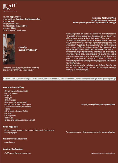 Την Πέμπτη 25 Ιουνίου 2015 και ώρα 20:00, σε μια όμορφη βραδιά, πραγματοποιήθηκε στο Σπίτι της Κύπρου, Ξενοφώντος 2Α, Σύνταγμα η προβολή του έργου «Πνοές» - κύκλος video art, του Κυριάκου Χατζημιχαηλίδη, που αποτελεί οπτικοποιημένη αναφορά σε συγκεκριμένα τμήματα του ποιητικού έργου σπουδαίων νεοελλήνων ποιητών: Κωνσταντίνος Καβάφης, Νίκος Καββαδίας, Κώστας Καρυωτάκης, Δημήτρης Χουλιαράκης.