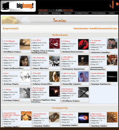 430 ταινίες μικρού μήκους σε διαδικτυακή προβολή. Τους τίτλους μπορείτε να τους δείτε στο site www.bigbang.gr (Το νούμερο στην αρχή συνεχώς αυξάνεται)