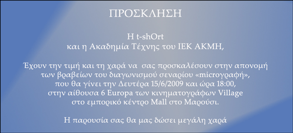 Δυνατή ιδέα, Μικρό σενάριο, Εφικτή παραγωγή, ήταν τα τρία χαρακτηριστικά της "microγραφής", ενός από τους πλέον σημαντικούς διαγωνισμούς σεναρίου για ταινίες μικρού μήκους μέχρι 5’, που σχεδίασε η t-shOrt, με συνδιοργανωτή την Ακαδημία Τέχνης του Ι.Ε.Κ «ΑΚΜΗ».