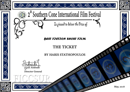 Συνεχίζει να συλλέγει βραβεία η παραγωγή της t-shOrt "Το Εισιτήριο" του Χάρη Σταθόπουλου. Απέσπασε το Βραβείο Καλύτερης μικρού μήκους ταινίας στο FICCSUR Southern Cone International Film Festival στη Χιλή!!!