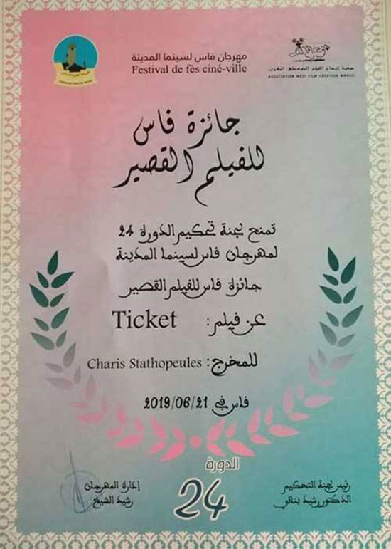 Το Big Prize spécial του 24ου Festival De Fès Ciné -Ville στο Μαρόκο κατέκτησε στις 21-6-2019, η πολυβραβευμένη παραγωγή της t-shOrt "Το Εισιτήριο" του Χάρη Σταθόπουλου, που με αυτό φτάνει αισίως τα 17!