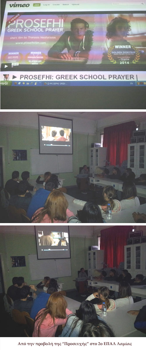Προβολή της παραγωγής της t-shOrt "Προσευχή" του Θανάση Νεοφώτιστου σε σχολεία (Οκτώβριος 2014-Μάρτιος 2015)