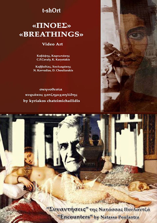 The video art "Breathings" by director Kyriakos Chatzimichailidis consist of eighteen well known poems of greek literature (Cavafy, Chouliarakis, Karyotakis, Kavadias, etc.) and last 55 minutes. Short in duration but with a special aesthetic and poetic value, this work portrays great works of greek literature in an exceptional artistic and original manner, reflecting fully the artist’s point of view, aiming to bring poetry closer to the public.