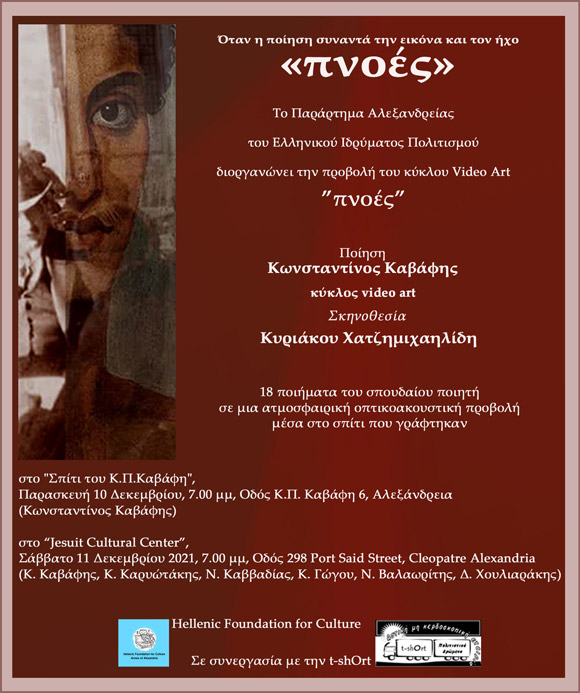 Το "Παράρτημα Αλεξανδρείας του Ελληνικού Ιδρύματος Πολιτισμού" και το "Σπίτι του Κ. Π. Καβάφη", σε συνεργασία με την t-shOrt, διοργάνωσαν δύο σημαντικές προβολές του έργου "ΠΝΟΕΣ" του Κυριάκου Χατζημιχαηλίδη, την Παρασκευή 10/12/2021, μέσα στο σπίτι του ποιητή, και το Σάββατο 11/12/2021 στον πολύ ωραίο νεανικό χώρο "Jessuit Cultural Center".