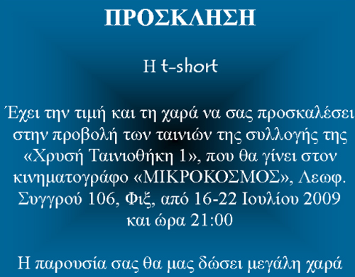 Πρόκειται για μια ιστορική «έξοδο» δέκα πολύ σημαντικών ταινιών μικρού μήκους, κλασικών πλέον στο είδος τους, που χαρακτήρισαν τον ελληνικό κινηματογράφο από το 1960 μέχρι και το 1994. Η t-shΟrt τις παρουσίασε, για πρώτη φορά όλες μαζί, σε ένα σπουδαίο πρόγραμμα προβολών δύο εβδομάδων, στον κινηματογράφο «Μικρόκοσμος».