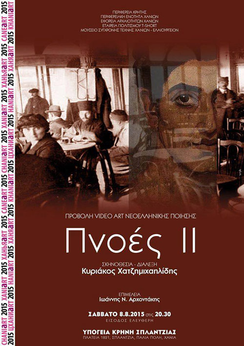 Σε μια ιδιαίτερα ατμοσφαιρική και γεμάτη μυσταγωγία βραδιά, εικαστικής επιμέλειας του Ιωάννη Ν. Αρχοντάκη, εξαιρετικοί καλλιτέχνες, φιλότεχνοι, συνεργάτες και πλήθος φίλων, υποδέχθηκαν θερμά, τιμώντας με την παρουσία τους, την προβολή της σειράς βιντεοτέχνης ΠΝΟΕΣ του Κυριάκου Χατζημιχαηλίδη στην Υπόγεια Κρήνη της Σπλάντζιας, Πλατεία 1821, στα Χανιά, το Σάββατο 8.8.2015.