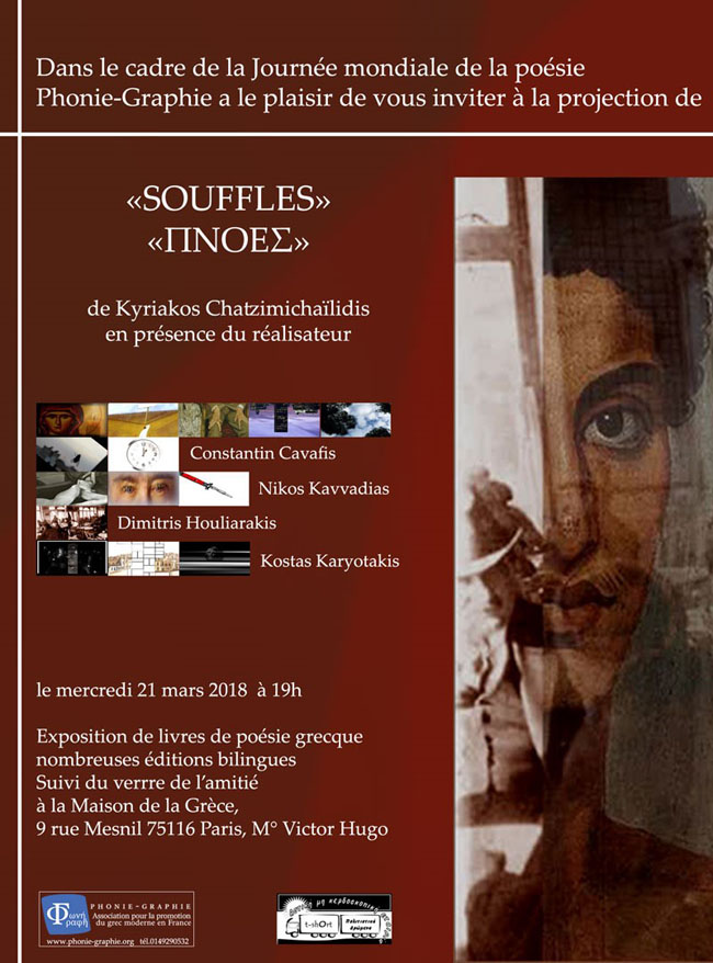 Με αφορμή την Παγκόσμια Ημέρα Ποίησης, οι "Πνοές" του Κυριάκου Χατζημιχαηλίδη, θα προβληθούν στο Παρίσι, παρουσία του σκηνοθέτη, σε εκδήλωση που διοργανώνει ο σύλλογος Φωνή - Γραφή (Phonie-Graphie) στο Maison de le Grèce, 9 rue Mesnil 75116 Paris M°Victor Hugo.