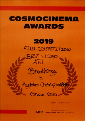 Με το Βραβείο Καλύτερου Video Art τιμήθηκε το έργο του Κυριάκου Χατζημιχαηλίδη "Πνοές" στο Cosmocinema Film Festival, στο Λονδίνο. (18/5/2019).